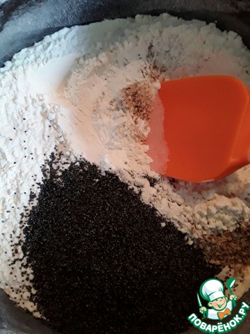 Соединяем в отдельной посуде, просеянную муку, разрыхлитель теста, мак и молотые орехи. Все хорошо перемешиваем.