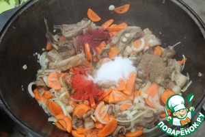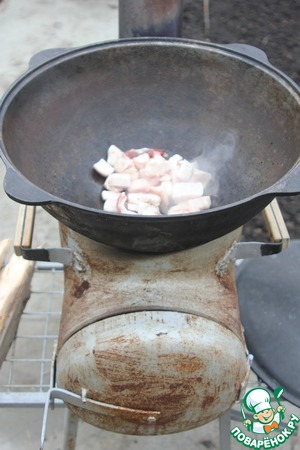 Нагреваем казан, выкладываем курдючный жир и вытапливаем его. Шкварки откидываем.