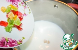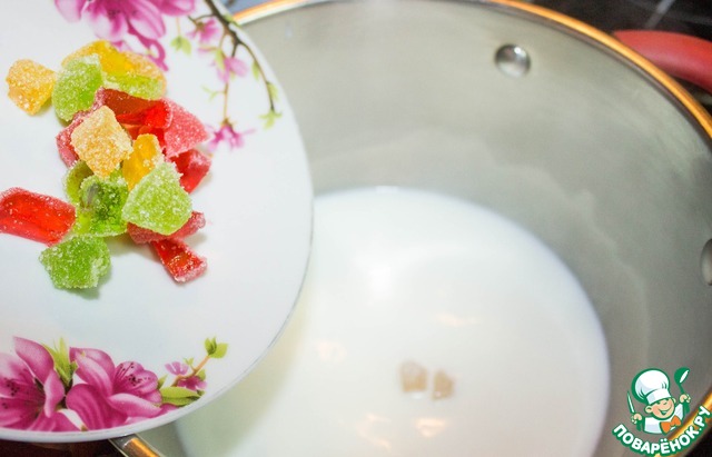 • В горячее молоко добавляем 1 столовую ложку мармелада, помешивая доводим до кипения.
