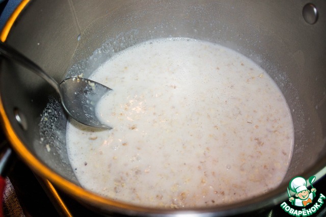 • В закипевшее молоко всыпаем хлопья и варим до готовности, помешивая.