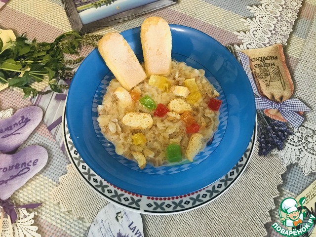 Овсяная каша это всегда вкусно. А ваш вариант еще и такой веселый. Пряник заменила на савоярди.