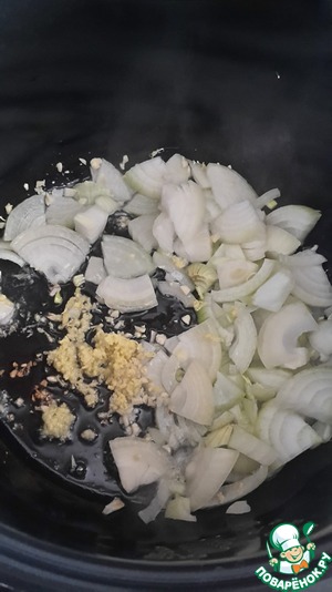 Включаем мультиварку, программа "Жарка", время 20 минут. Лук, чеснок и имбирь обжариваем 10 минут до золотистости на растительном масле или гхи, если такое водится в закромах.