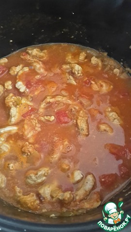 Заливаем мясо 150 мл кипятка и добавляем банку рубленых помидоров в собственном соку. Выставляем программу "Тушение" 60 минут по умолчанию.