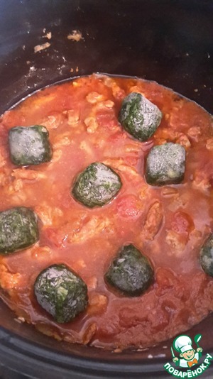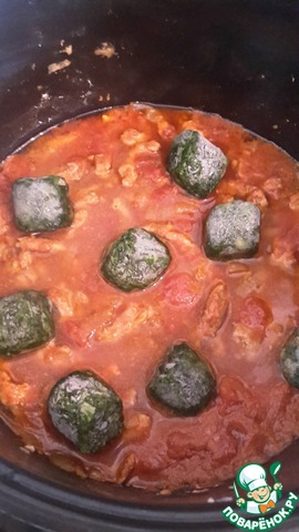 За 10 минут до окончания программы добавляем соль и замороженный шпинат. На фото видно, что мой шпинат заморожен порциями размером с грецкий орех. За 10 минут он успевает дойти. Если ваш шпинат заморожен кусками покрупнее, то ему понадобится больше времени, чтобы прогреться.