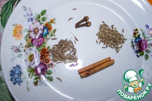В кипящую воду закидываем специи:корицу, гвоздику, тмин и зиру, солим.