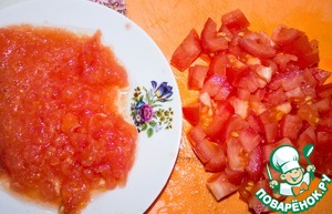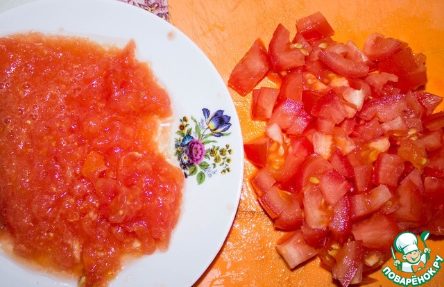 Готовим соус. Один помидор мелко нарезаем, второй натираем на терке.