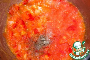 Добавляем помидорное пюре, перец черный, душистый. Тушим, помешивая,7 минут. Снимаем огня. Соус готов.