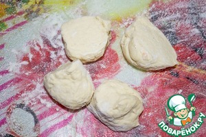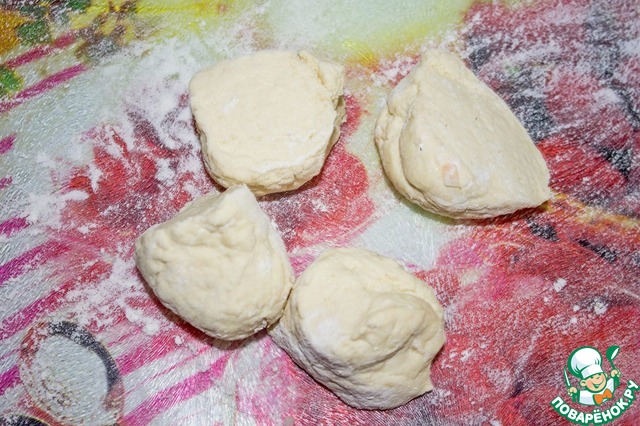 Отдохнувшее тесто обминаем пару раз, делим на 4 части. В это же время ставим сухую сковороду на огонь.