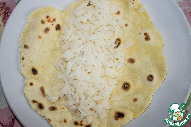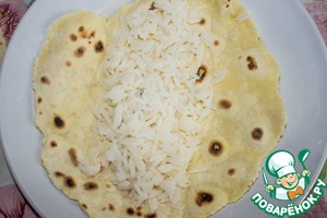 На лепешку выкладываем рис. -