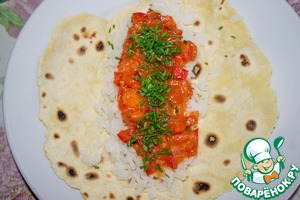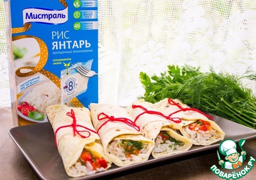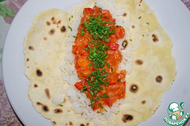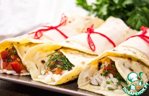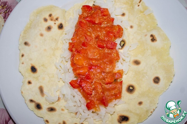 Лепешки готовы, соус готов, рис сварился. Собираем рулетики!