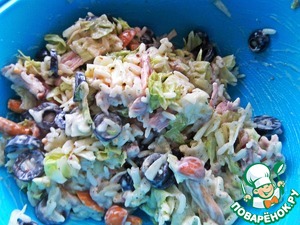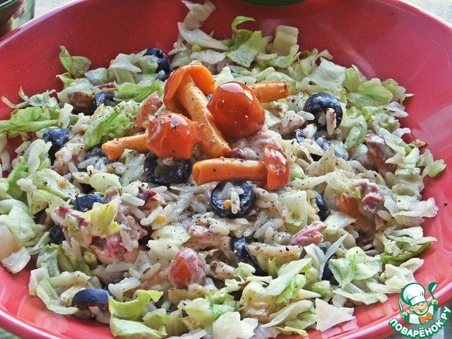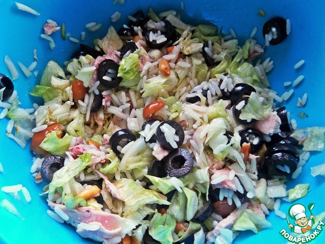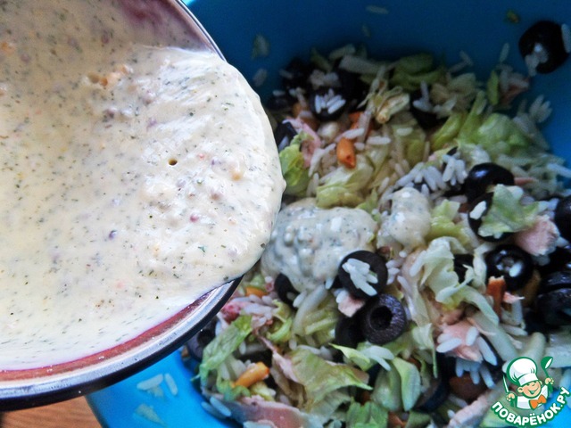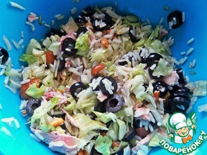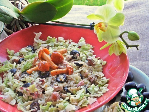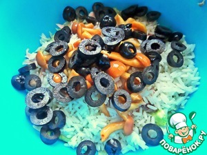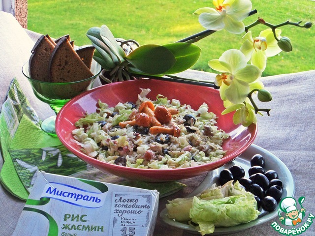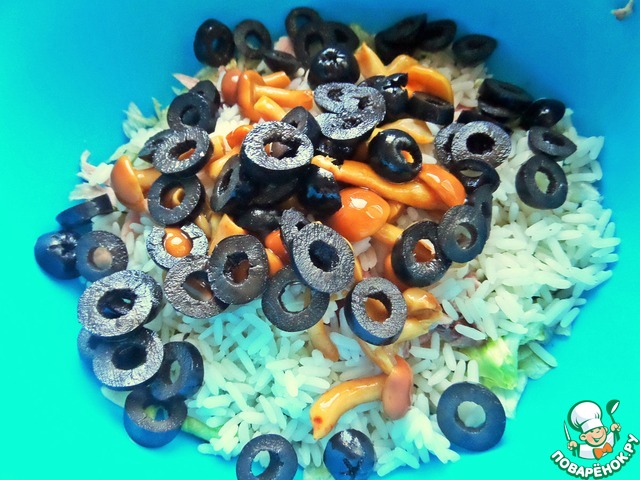 Салат на кефирной заправке. Сочетание курицы и риса, курицы и грибов всем знакомо и нравится! Я объединила три компонента в один салат, добавила маслины для большей пикантности, вместо майонеза заправила не менее пикантным кефирным соусом. Получилось по-новому вкусно, что и хотелось, понравилось)))