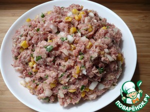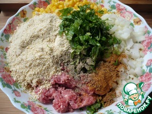 Затем перекладываем фарш в широкую и глубокую емкость, в которой его будет удобно перемешивать. Арахис измельчить в блендере (вместо арахиса я взяла орехи кешью). В мясной фарш добавить: нарезанный лук, кукурузу, измельченный арахис, нарезанную кинзу, специи и соль по вкусу, соус Табаско (несколько капель).