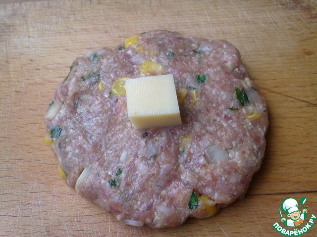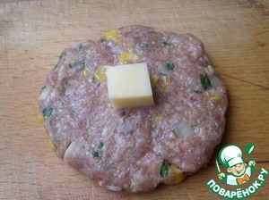 Теперь берем кусок фарша, размером как на обычную котлету. Делаем круглую лепешку, толщиной не менее 1 см, и в центр лепешки кладем сырный кубик.