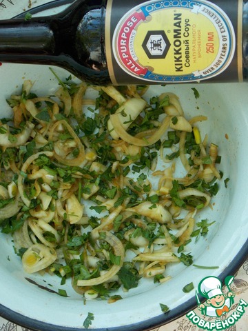 • За то время пока наши купаты обжариваются, мы режем лук и зелень, перемешиваем. Добавляем соевый соус ТМ "Kikkoman", перемешиваем.