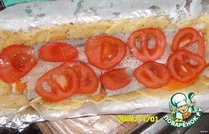 затем слой рыбы, помидоры, лук и остаток картошки.