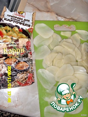 тонко нарезать картошку, морковь, помидоры, по желанию добавить специи (не переборщите).