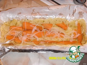 Разложить картошку, рыбу, лук, морковь, -