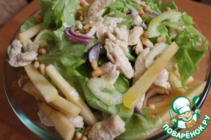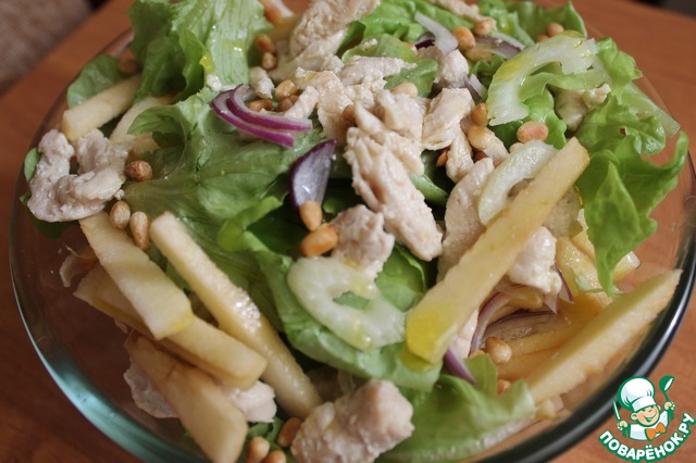 В миске смешать лук, сельдерей, виноград, курицу, яблоко и листья салата. Полить оливковым маслом и лимонным соком. Посыпать кедровыми орешками. Вкуснейший, легкий и полезный салат готов!)