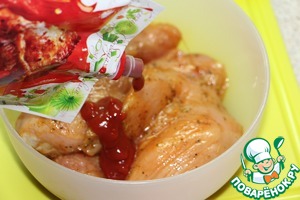 Филе индейки нарезать порционными кусками, слегка отбить, залить маринадом и оставить в холодильнике на сутки.