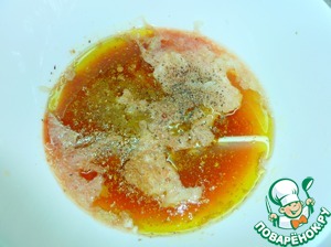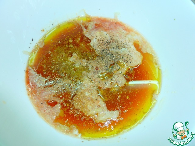 К луку добавить оливковое масло, сильногазированную минеральную воду, аджику, орегано, соль и перец, перемешать. -