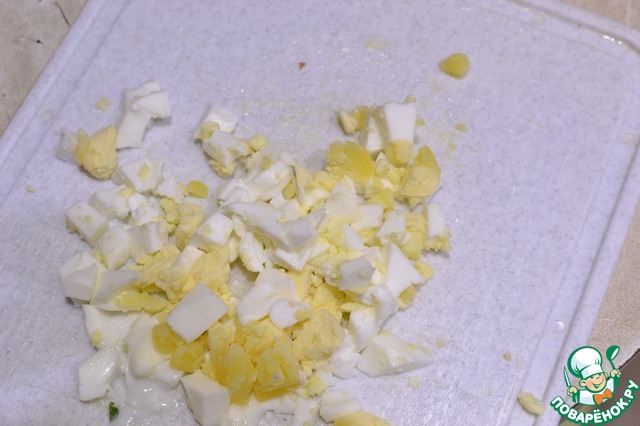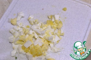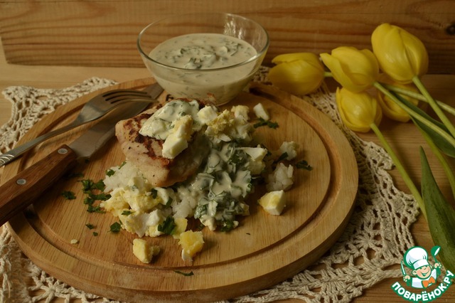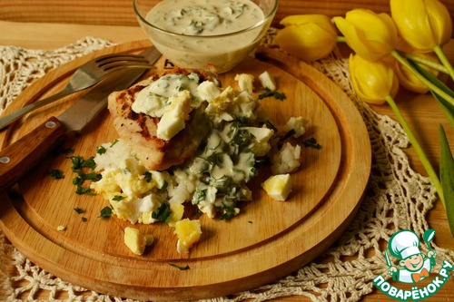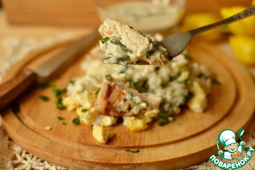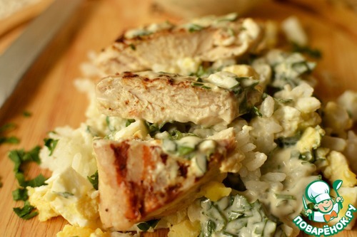 Выкладываем рис, филе, поливаем зеленым соусом и посыпаем рубленым яйцом. Как вариант, яйцо можно добавить сращу в соус и перемешать.