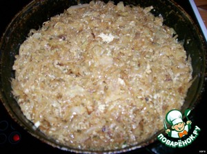 Капусту для теста нарезать очень мелко (можно пропустить через мясорубку, но не через блендер), слегка присолить и помять, луковицу натереть на терке или тоже очень мелко изрубить, также и зелень.