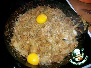 Вводим сырые яйца и обжариваем до свертывания яиц при постоянном помешивании, добавляем мелко нарубленную свежую или сухую зелень. Сырые яйца в начинке можно заменить отваренными вкрутую и мелко порубленными.