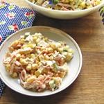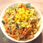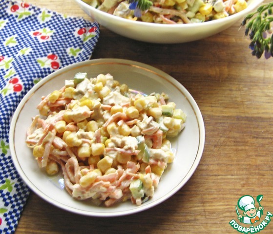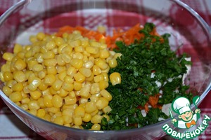 Выложить ингредиенты в салатник, добавить консервированную кукурузу.
