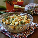 Для заправки смешать йогурт (сметану, мацони) с горчицей и лимонным соком. Посолить (немного), поперчить по вкусу. Заправить салат, хорошо перемешать.