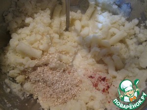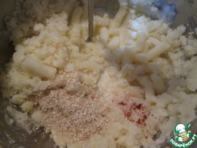 Картофель отварите до готовности, растолките, добавьте сливки, кокосовую стружку, кунжут, сахар и чили. Хорошенько размешайте и добавьте мелко порезанную зелень.