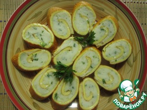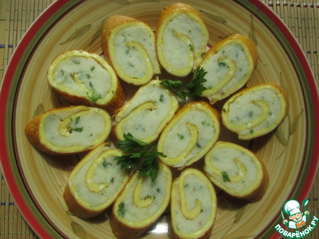 Порезать рулет кусочками, подавать со сметаной и зеленью.