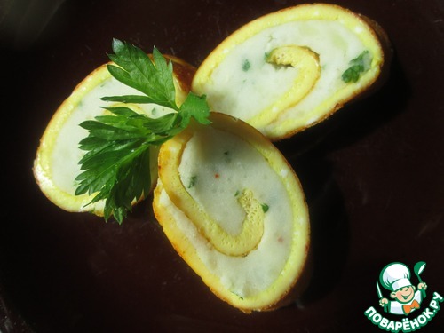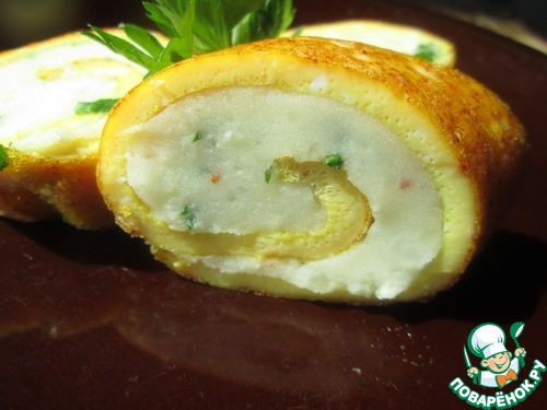 Аккуратно вынимаем омлет из формы, раскладываем по нему картофельное пюре, сворачиваем плотный рулет.