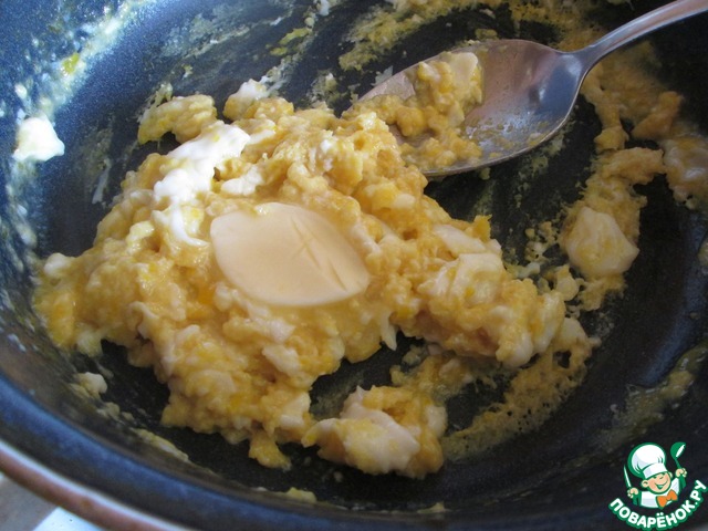 Готовим, помешивая. Не передерживайте, омлет должен быть нежным. Снимаем с огня и добавляем сливочное масло.