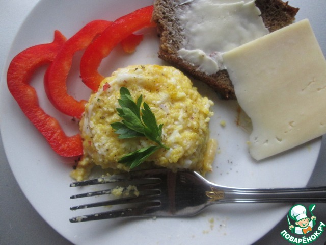Все, наш омлет готов. Я его приперчила для пикантности. Мне очень понравилось сочетание с солоноватым сыром.
