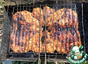 Выкладываем грудки на решётку-гриль и жарим на углях до готовности.