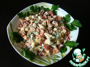 Этот салат очень любят в нашей семье, готовим его и на праздники и в будни, когда хочется порадовать себя вкусненьким. Состоит всего из 3-х основных ингредиентов, которые берутся в равных пропорциях. Попробуйте, уверена он Вам полюбится!