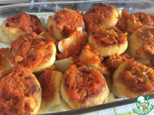 Форму с картошкой достать из духовки, выложить прямо на картошку фрикадельки. Сверху распределить морковь с луком. Можно еще посолить и добавить специи. Оставшийся томат размешать с водой и залить блюдо. Можно взять томатный сок.