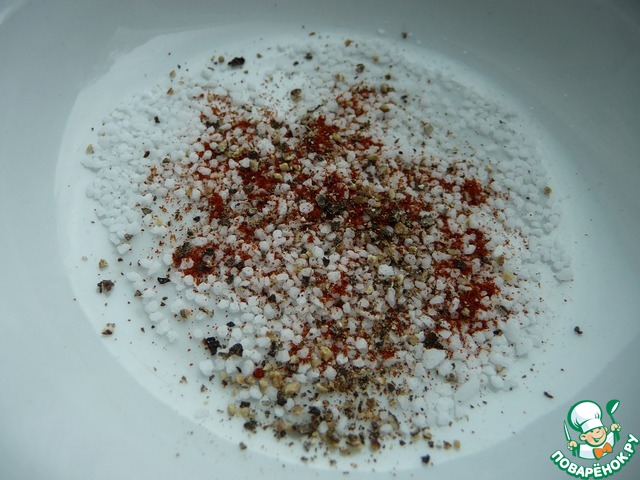 В мисочке смешать соль, красный сладкий и черный перец. Если у вас есть черная соль, копченая, вулканическая с травами - используйте ее.