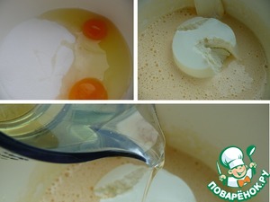 Яйца взбить в пышную пену с сахаром, ванильным сахаром. Добавить рикотту, растительное масло - взбить.
