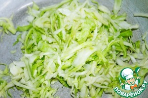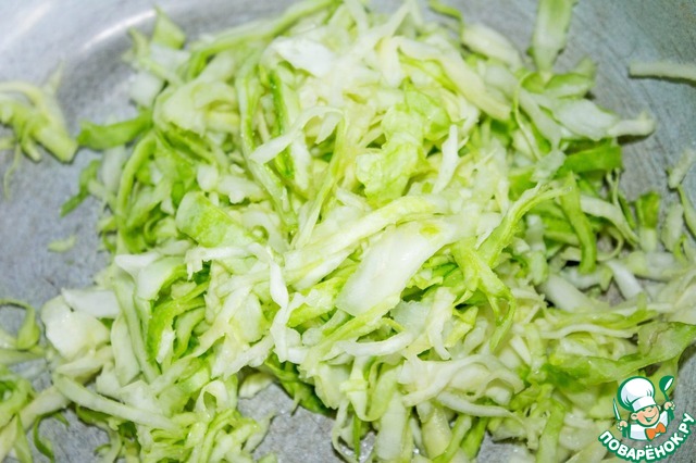 • Капусту шинкуем, присаливаем и немного жмем руками, чтобы стала сочной.