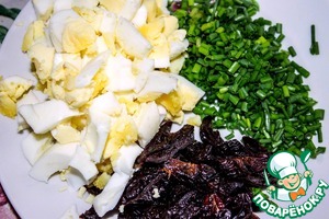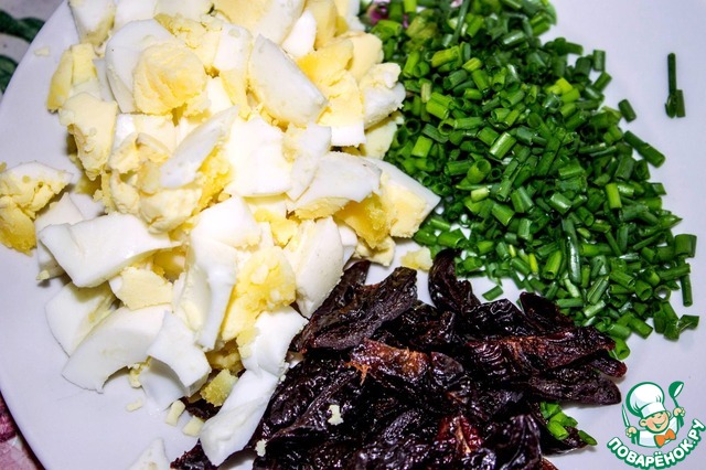 Яйца и чернослив не крупно крошим, лук тоже мелко нарезаем.