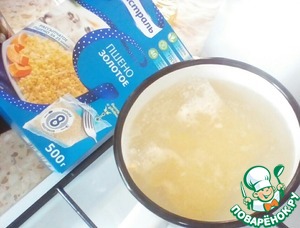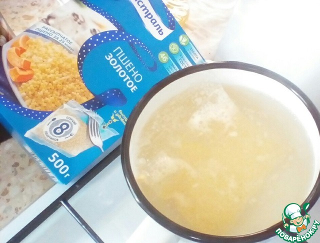 Как только вода закипела, опускаем в неё пакетик с пшеном и приступаем к самому супу.