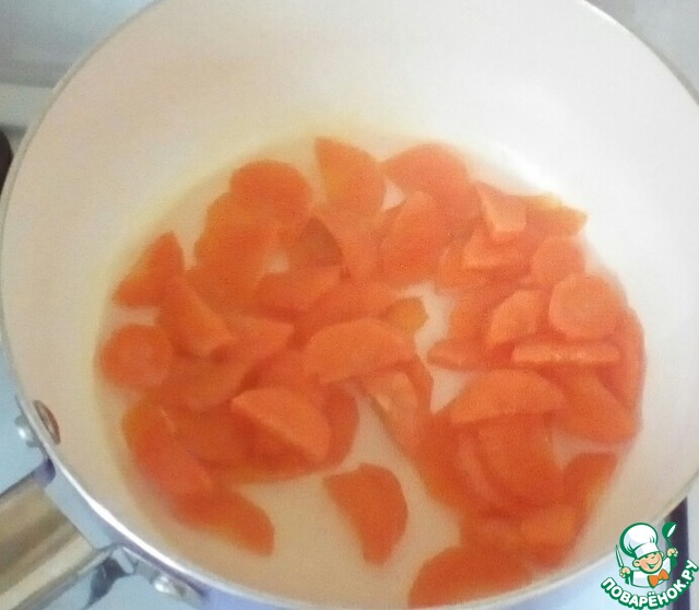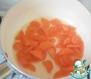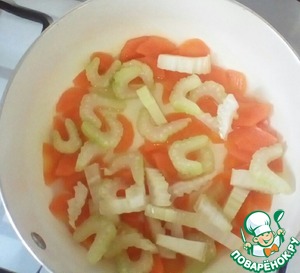 В сотейнике или кастрюле доводим до кипения небольшое количество воды, "на донышке". Кладем нарезанную морковь и припускаем 1 минуту. Я не люблю обжаренные овощи в супе, поэтому просто припускаю их в небольшом количестве воды. Вы можете сделать также, либо обжарить их на масле.