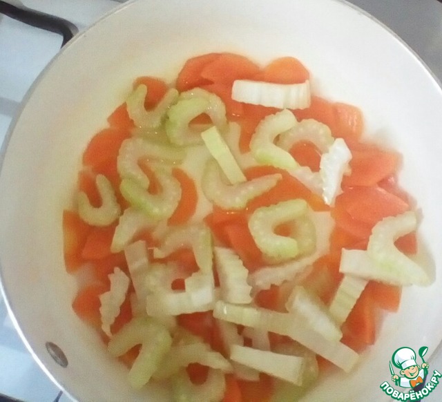 Следом кладем сельдерей и также держим на сильном огне 1-2 минуты.