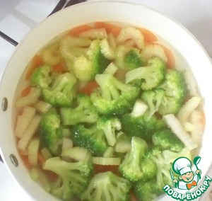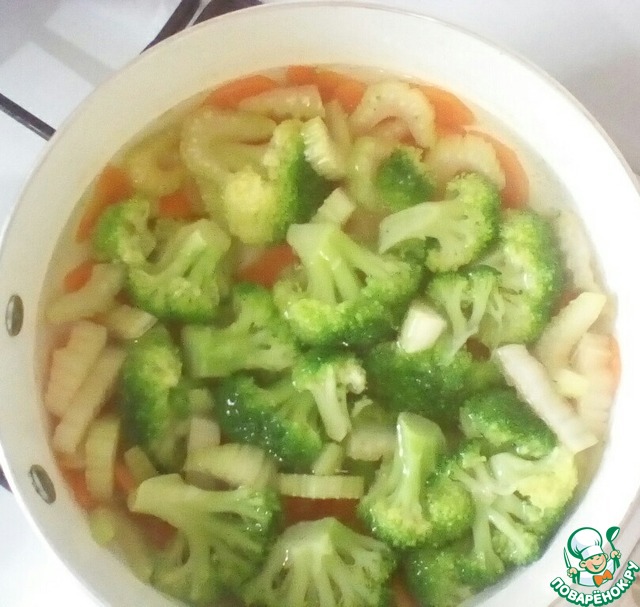 Теперь наливаем в сотейник заранее подготовленную горячую кипяченую воду, добавляем брокколи. На этом этапе суп подсаливаем по вкусу, добавляем выбранные специи (я использую только перец горошком). Закрываем крышку и варим на небольшом огне 5 минут.