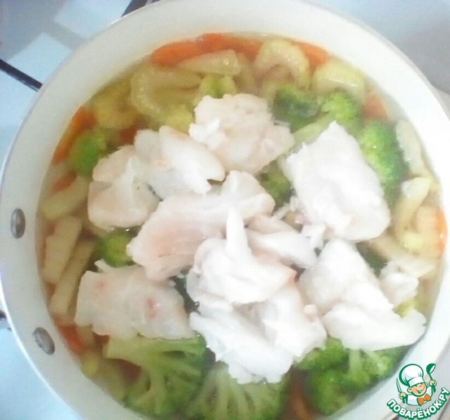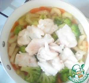 Следующий ингредиент - кусочки рыбного филе. Также добавляем их в суп.