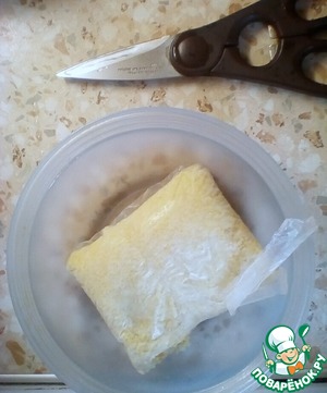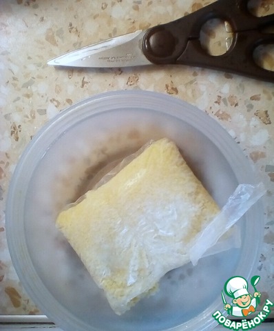 Через 20 минут после начала варки пшена достаем пакетик с ним. Даем стечь воде, разрезаем пакетик и добавляем пшено в суп.