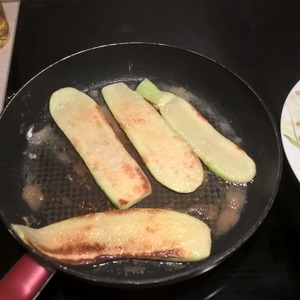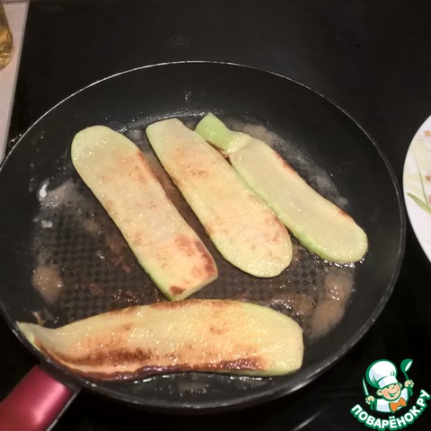 Примерно так же делаю и я. Только кабачки обжариваю на грильной сковороде без масла и без муки.