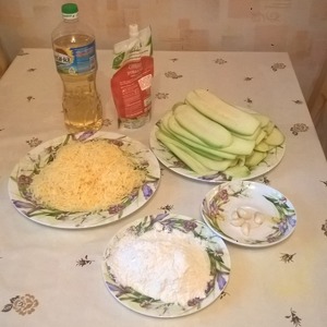 • Кабачки обваливаем в муке и обжариваем с двух сторон на растительным масле.