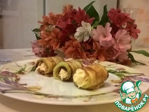 • На обжаренные кабачки накладываем сырно-майонезную смесь и сворачиваем в рулетики.